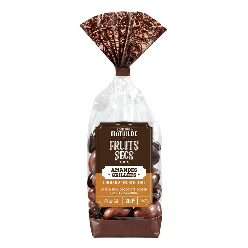 Chocolat au LAIT 32,5% (sucre, beurre de cacao, poudre de LAIT entier, p?te de cacao, ?mulsifiant : l?cithine de SOJA, ar?me naturel de vanille. Cacao : 31% minimum), chocolat noir 32,5% (p?te de cacao, sucre, beurre de cacao, ?mulsifiant : l?cithine de SOJA. Cacao : 60% minimum), AMANDE 32%, agents d’enrobage : gomme arabique, shellac, sucre, sirop de glucose.