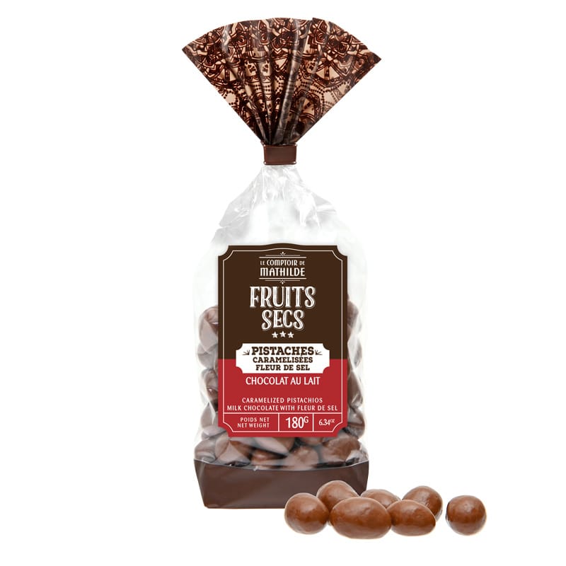 Chocolat au LAIT 66% (sucre, beurre de cacao, poudre de LAIT entier, p?te de cacao, ?mulsifiant : l?cithine de SOJA, ar?me naturel de vanille. Cacao: 31% minimum), PISTACHE 21%, sucre, fleur de sel 0,5%, agents d?enrobage : gomme arabique, shellac; sucre, sirop de glucose.
