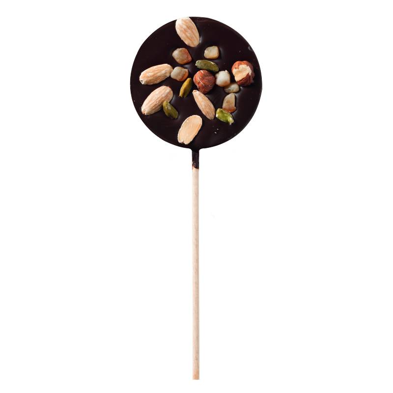 Chocolat noir 86% (p?te de cacao, sucre, beurre de cacao, ?mulsifiant : l?cithine de SOJA, ar?me naturel de vanille. Cacao: 70% minimum.), m?lange de fruits secs 14% (?clats de NOISETTES caram?lis?es (NOISETTES, sucre, caramel (sucre, eau)), ?clats d’AMANDES caram?lis?es (AMANDES, sucre, caramel (sucre, eau)), PISTACHES, ?corce d’oranges confites (?corce d’oranges, sirop de glucose, sucre, dextrose).