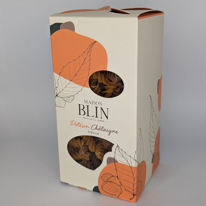 Ingrédients : Farine de Blé dur de qualité supérieure, eau, châtaigne (30%), potiron (10%)