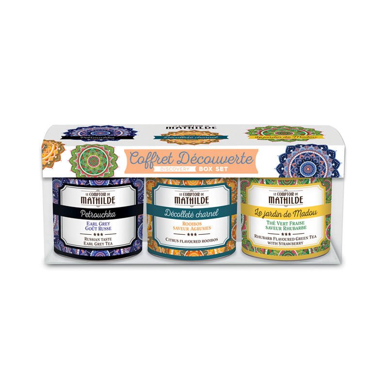 M?lange de plantes pour infusion : Rooibos, ar?me naturel d’orange 2%, ar?me naturel d’agrumes, fleur de souci, ar?me. Th? vert Sencha aromatis? fraise rhubarbe : Th? vert Sencha, ar?me, morceaux de fraise 0,5% (sirop de glucose, fraise, fructose, amidon modifi?, ?paississant: alginate de sodium), ar?mes (dont rhubarbe 0,2%). Th? Earl Grey go?t russe : Th? noir de Chine, ar?me naturel d’orange, ar?me, ?corce de citron, ar?me naturel d’agrumes, p?tales de tournesol.